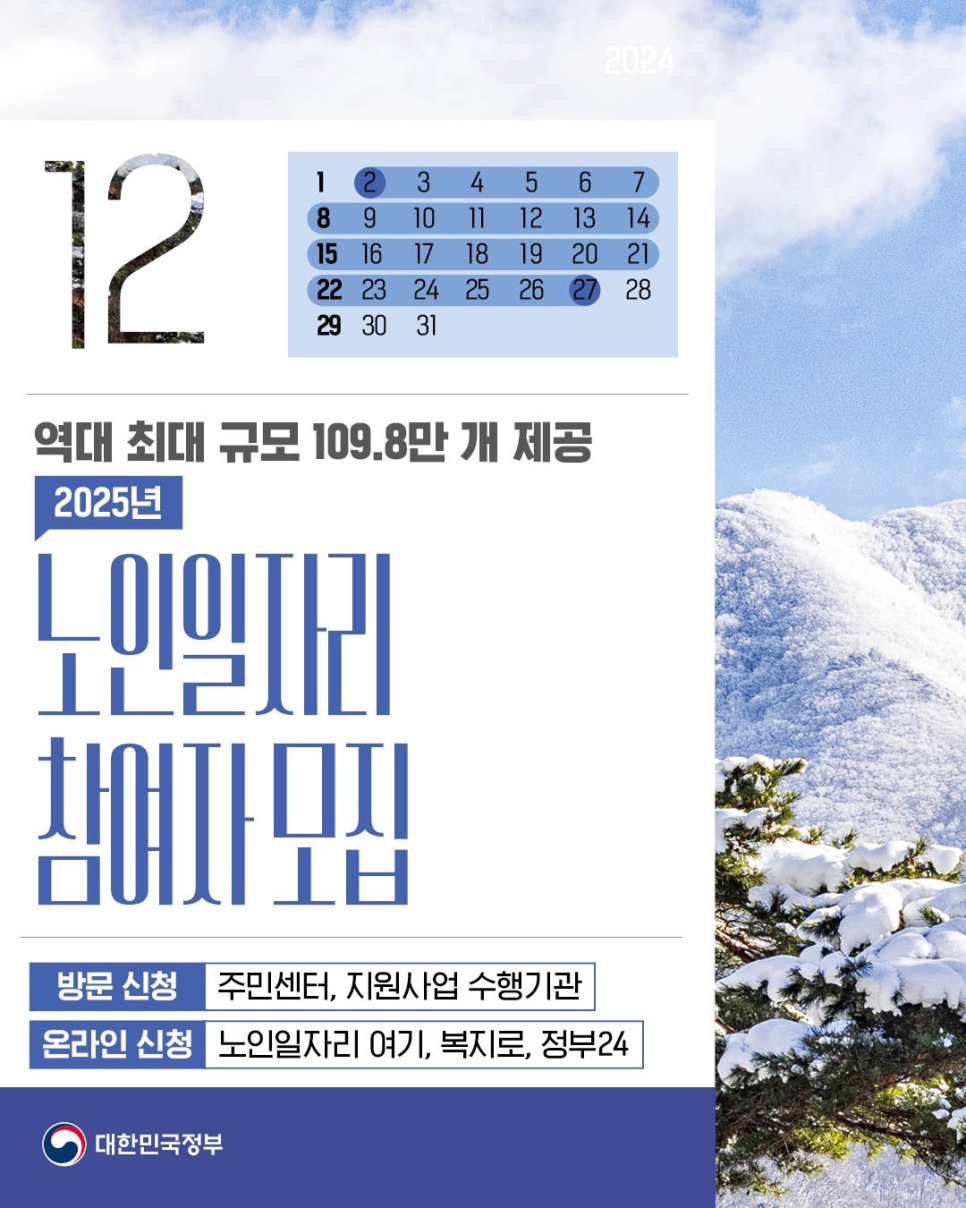 국민 행복 일자리, 노인일자리 사업 신청하세요 - 12월 2일(월)부터 12월 27일(금)까지 2025년 참여자 집중 모집 - - 2025년 노인일자리 역대 최대 규모 109.8만 개 제공- - 2025년 노인일자리 예산 2조 262